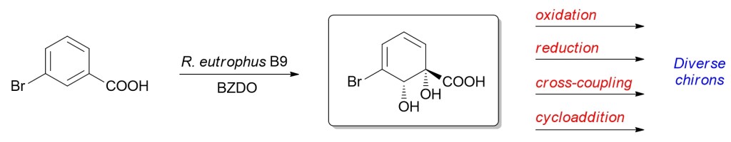 23.) “Benzoate dioxygenase from Ralstonia eutropha B9 – unusual regiochemistry of dihydroxylation permits rapid access to novel chirons”, Griffen, J. A.; Kenwright, S. J.; Abou-Shehada, S.; Wharry, S.; Moody, T. S.*; Lewis, S. E.* Org. Chem. Front., 2014, 1, 79, doi:10.1039/c3qo00057e